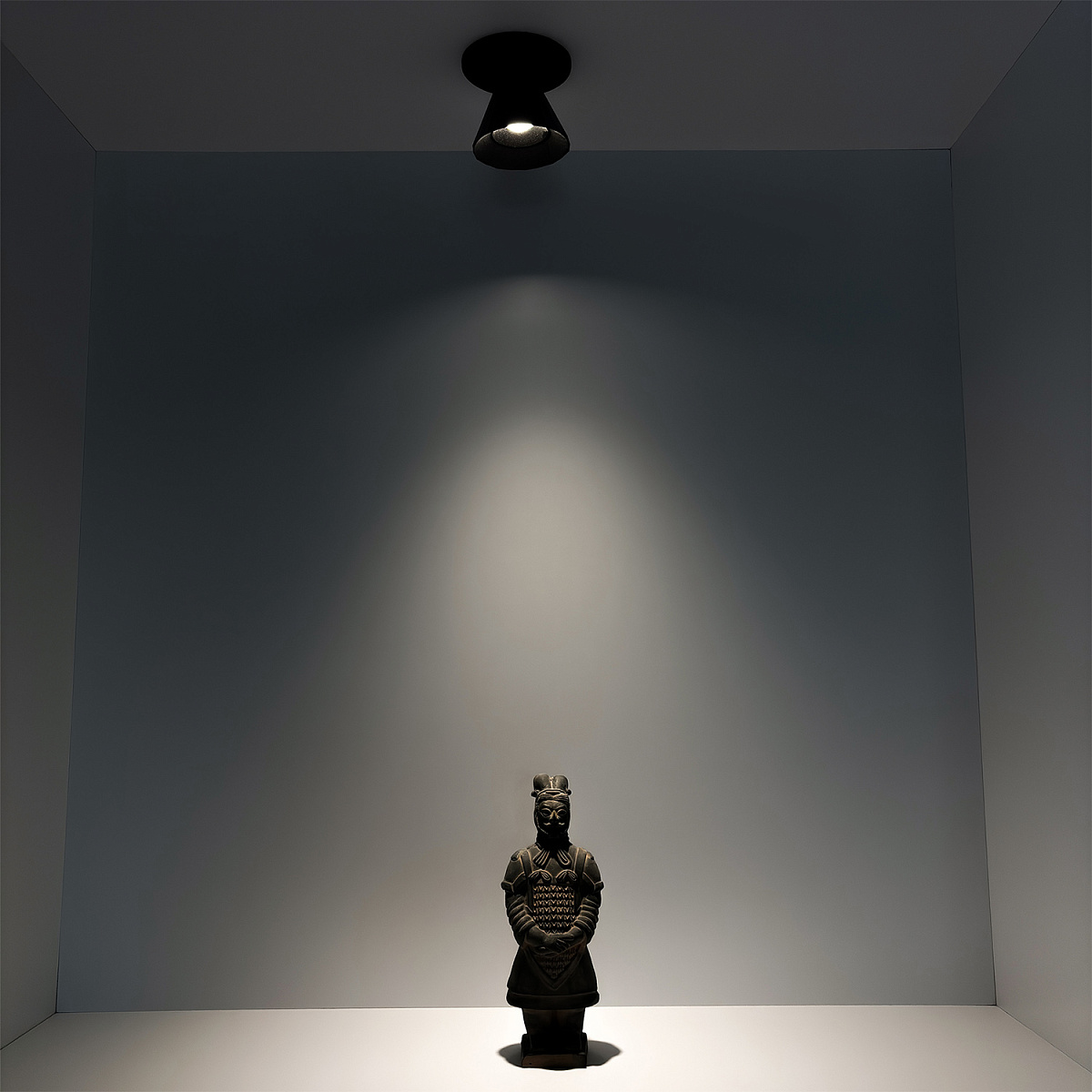 Даний світильник органічно виглядатиме в арт-просторах, шоурумах, магазинах, виставкових і торгових центрах, а також у житлових приміщеннях. Його корпус виготовлений з алюмінію, а сам прилад пофарбований у класичний чорний колір.