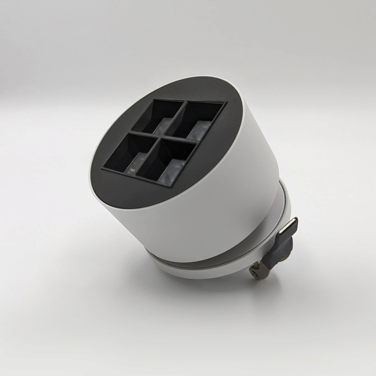 Корпус виробу виконаний у циліндричній формі з квадратними отворами, всередині них вбудовано яскравий світлодіод.